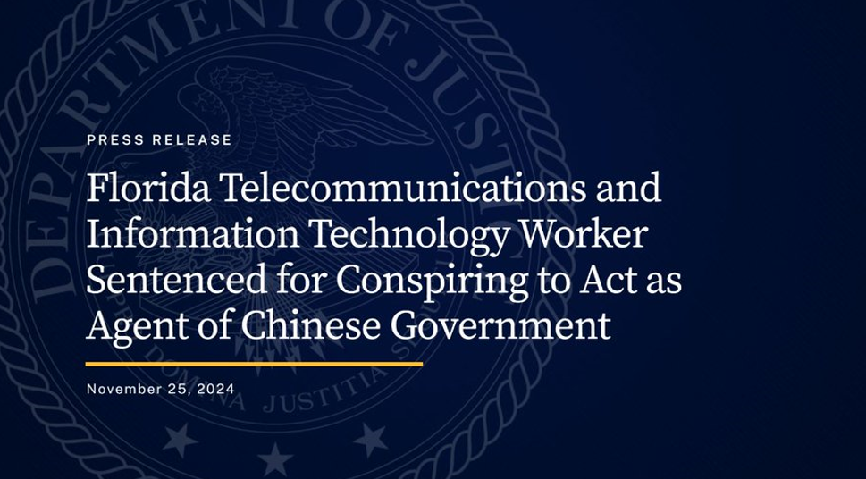 Act as Agent of Chinese Government : https://justice.gov/opa/pr/florida-telecommunications-and-information-technology-worker-sentenced-conspiring-act-agent
